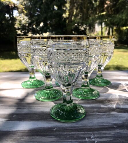 Alt 6x Weingläser Gläser brillant EDEL Goldrand grüner Stand Glas