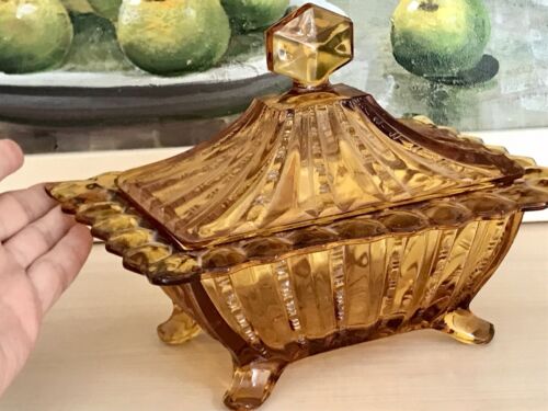Antik Art Déco Brockwitz Prismen Dose Deckeldose Pressglas Bernstein Gelb Glas
