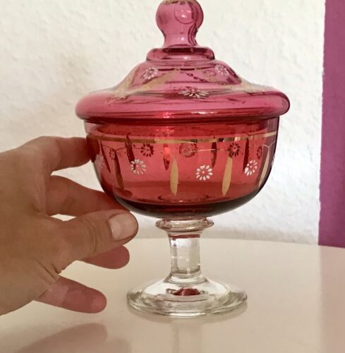 Antik Bonboniere Dose Glasdose Deckeldose Rubin rot Email Golddekor Fußschale