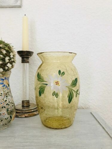Antik Craquelée Edelweiß Gelb Vase Glasvase Emaile-Malerei Art Déco