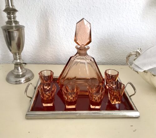 Antik EDEL Kristallglas Art Déco Karaffe Likörgläser Set 6 Gläser Rosalin mit Tablett !!