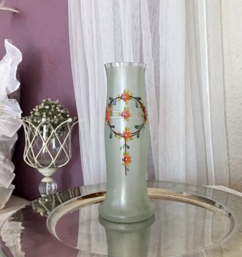 Antik Jugendstil Vase Glasvase satiniert optisch zartgrün Glas Email-Bemalung
