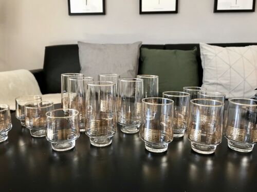 Alt Vintage 60er 16x Becher Gläser 3 Größen Trinkbecher Gläser Mäander Golddekor