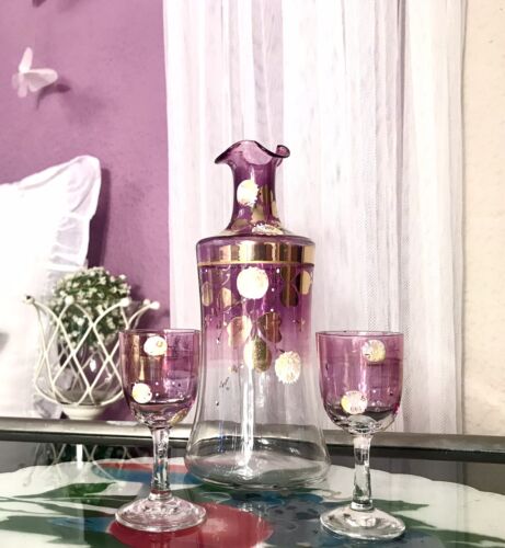 Antik Likör Karaffe Flasche Glas rosa 2 Likörgäser Gläser Jugendstil Email Golddekor