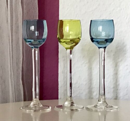 Antik langstielig 3 Jugendstil Glas Likörgläser Stengelglas 1 gelb 2 blau