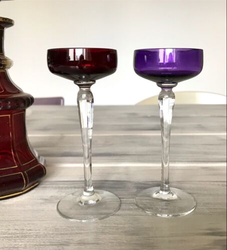 Antik langstielig 2 Jugendstil Glas Likörgläser Stengelglas gerippt rot & lila
