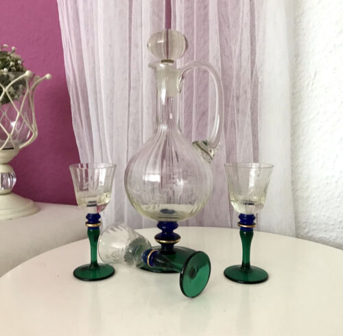 Antik Likör Glas Karaffe Flasche mit 3 Likörgläser Jugendstil Schliff gerippt