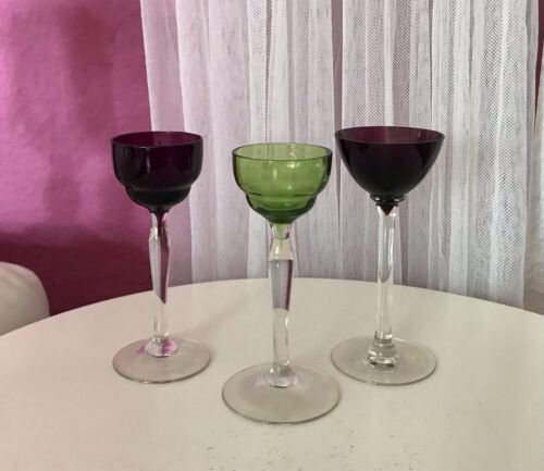 Antik langstielig 3 Jugendstil Glas Likörgläser Stengelglas gerippt 2 lila grün