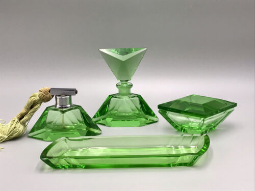 EDEL Art Déco antik 4Teile Kristallglas Frisiertisch Garnitur Dose Flacon grün