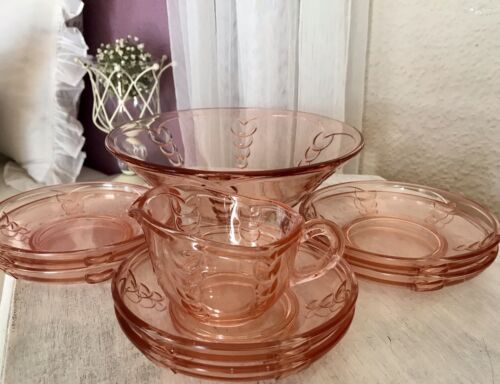 Vintage Schale 6 Schälchen Kännchen Rosalin Rosa Pressglas Pudding-Set