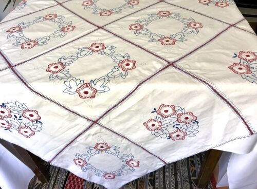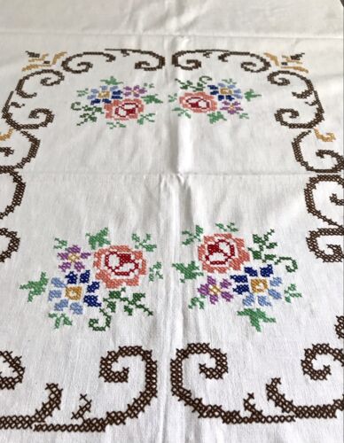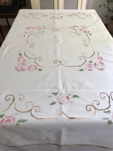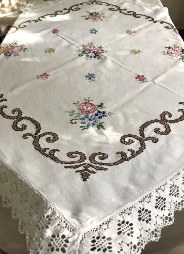 Antik Tischdecke 141x134 bunte Rosen Kreuzstickerei Baumwolle geschmackvoll!