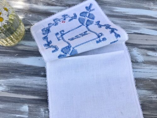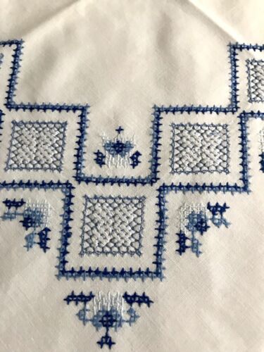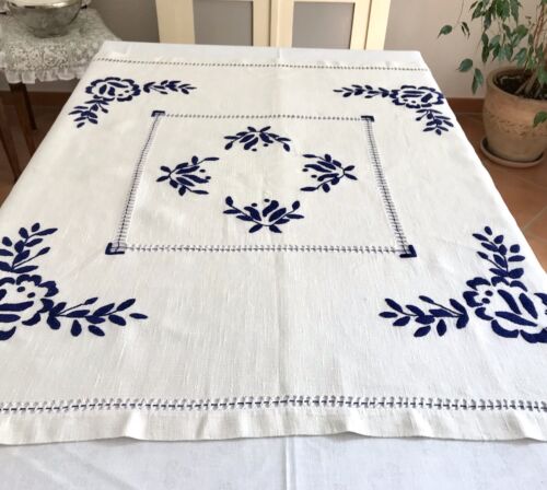 Antik Edel Tischdecke Tafeltuch 95 x 93 weiß blau Leinen bestickt Art Déco