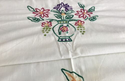 Antik Edel Tischdecke Tafeltuch 116 x 109 weiß Leinen bunt bestickt Art Déco