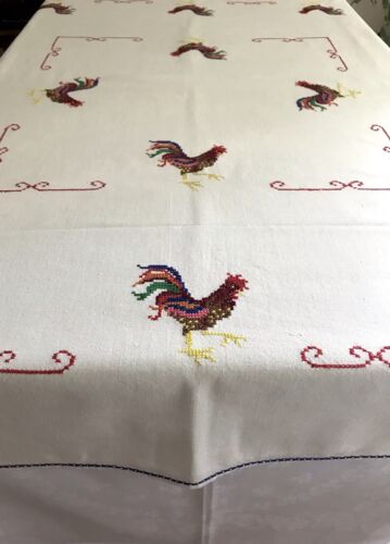 Antik Tischdecke 136x136 bunte Kreuzstich Stickerei Hahn Baumwolle WunderSCHÖN