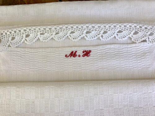 Antik Alt um 1920 Überhandtuch Spitze Behang Gardine weiß Monogramm MH