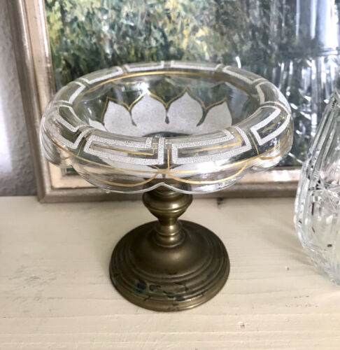 Antik Biedermeier Schale Glasschale Tafelaufsatz geätzt Glas Mäander Messing