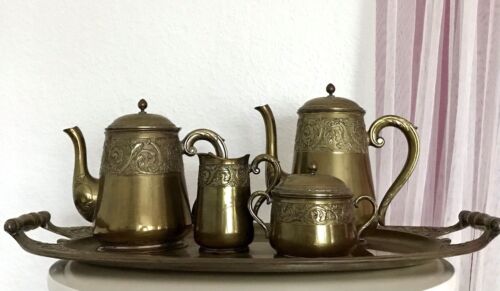 Antik Kernstück Zuckerdose Rahmgießer 2 Kanne Tablett Messing ehemals versilbert