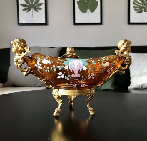 Antik Jardiniere Schale Glas Tafelaufsatz Bronze? feuervergoldet Putti Murano?