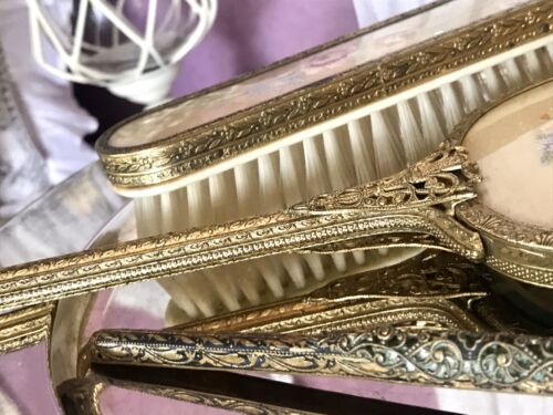 Antik Frisierset Kleiderbürste Handspiegel Kamm Messing gold Edel Petit Point