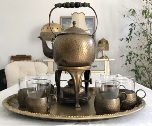 Antik Art Déco Tee Set Kanne Rechaud Stövchen Brenner Tablett Glashalter Messing