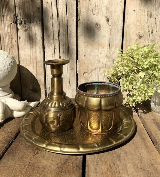 Antik Art Déco Raucherset Kerzenständer Dose Tablett Messing