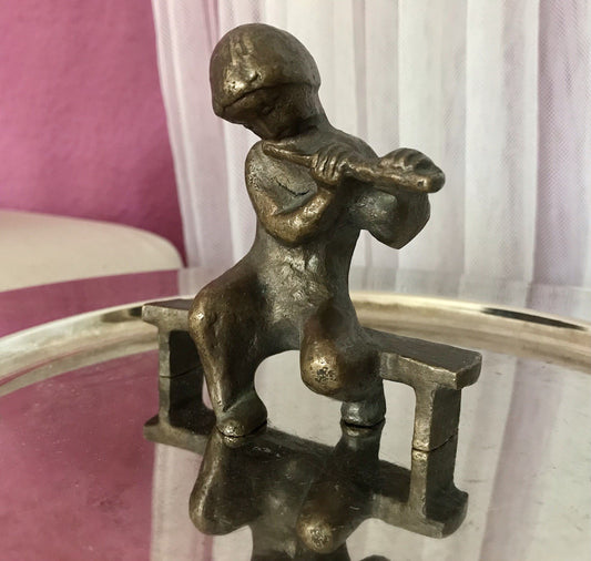 Vintage Bronze Figur Kind Junge Skulptur Fischedick Junge mit Flöte auf der Bank