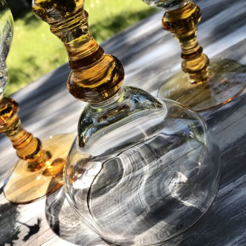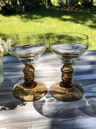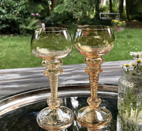 Antik 2x Jugendstil Glas Römer Weingläser Eichstrich 3/20 L Hohlschaft braungelb