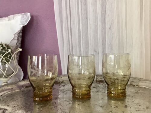 Antik 3x gelb Becher Trinkbecher Weinbecher Fußbecher Gläser Schliff Holzträger