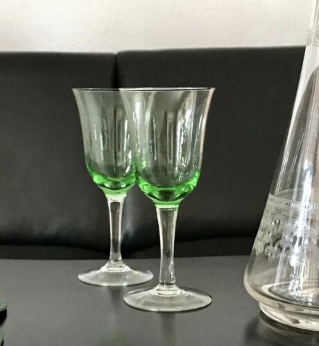Antik 2x Jugendstil Stengelglas grün Stängelstiel Sammlerglas Weingläser Schliff