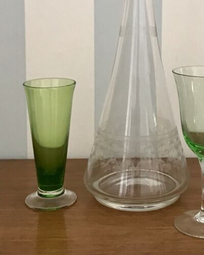Antik 6+1 Jugendstil Art Déco Stengelglas gelb grün Stängelstiel Weingläser
