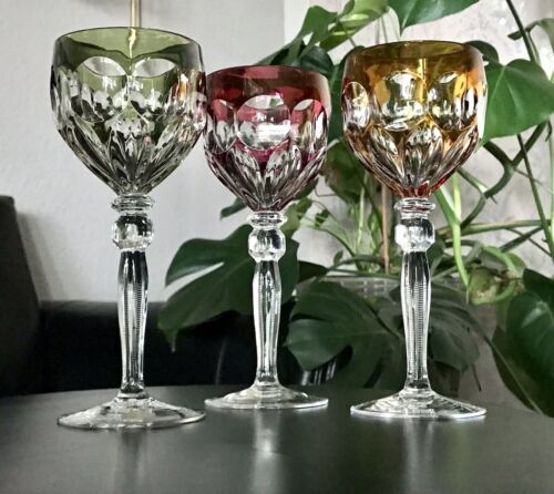Antik ? 3 Art Déco Weingläser Römer Kristallglas Schliff gebeizt rot gelb grün