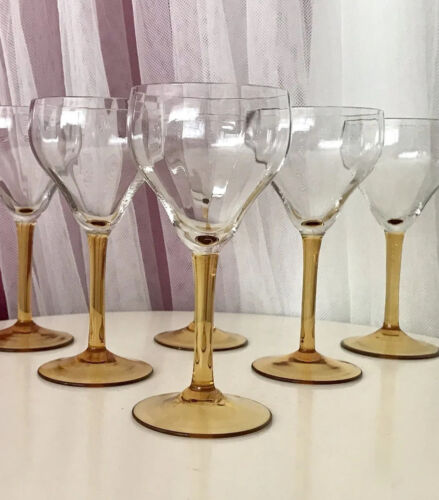 Antik 6x Art Déco Weingläser topasgelber Stiel optisch gerippt