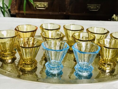 Antik Art Déco 12x Likör Gläser Pressglas bernstein gelb & blau Likörglas Glas