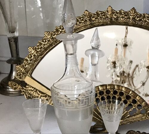 Antik Karaffe Biedermeier Mäander Abriss 2 Schnaps Likör Gläser Glas satiniert