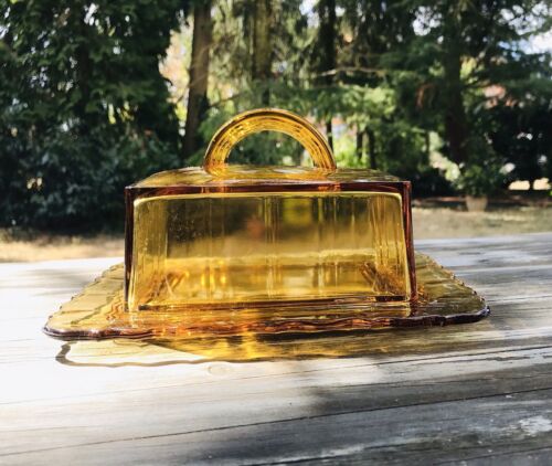 Antik Art Déco Glas GROß Pressglas Butterglocke Butterdose Bernstein Gelb Amber