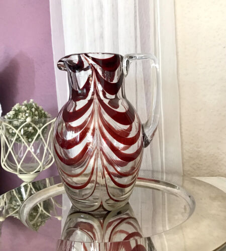 Antik Kanne Krug Glaskrug Karaffe Glas mundgeblasen schwer Kammdekor rot Abriss