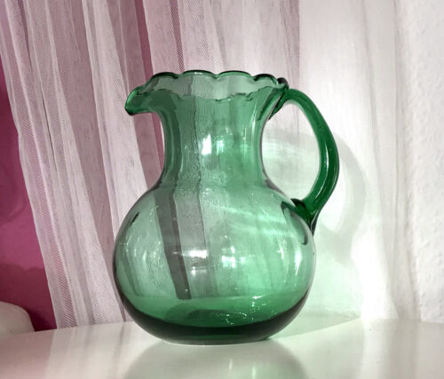 Antik Kanne Krug Glaskrug Karaffe Glas mundgeblasen grün gewellter Rand