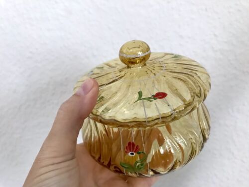 Antik Art Déco Form geblasen Dose Konfektdose Glas optisch gerippt Gelb bemalt