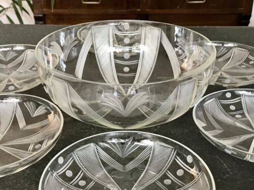 Antik Art Déco Glas Schale & 6 Schälchen Puddingschale Schliff Weisswasser??