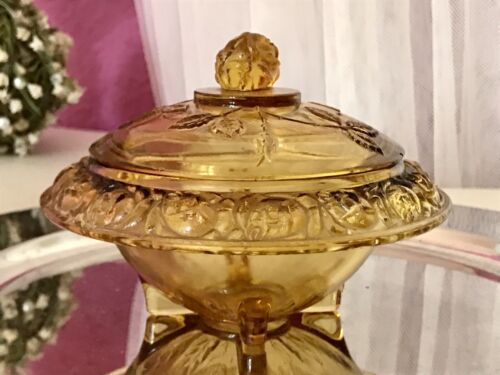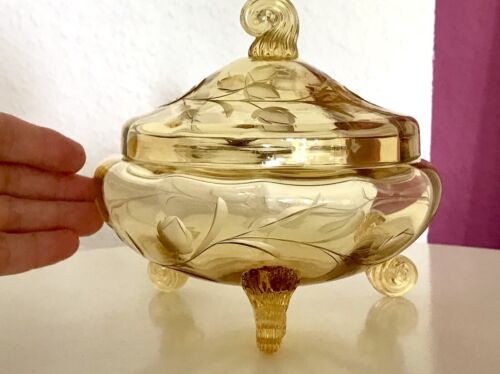 Antik Art Déco Glas Dose Honigdose Glasdose Pressglas Bernsteingelb gelb Rosen