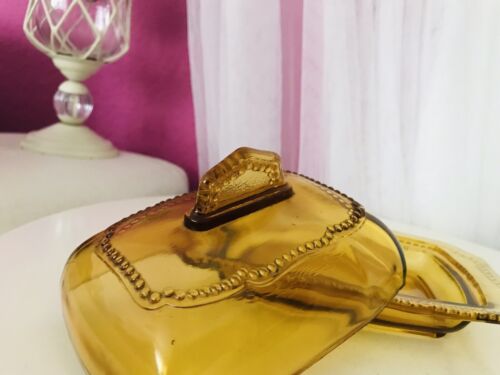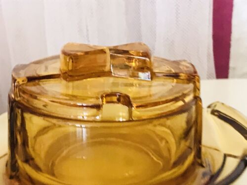 Antik Art Déco Glas Pressglas Butterglocke Butterdose Bernstein Gelb Tauperle