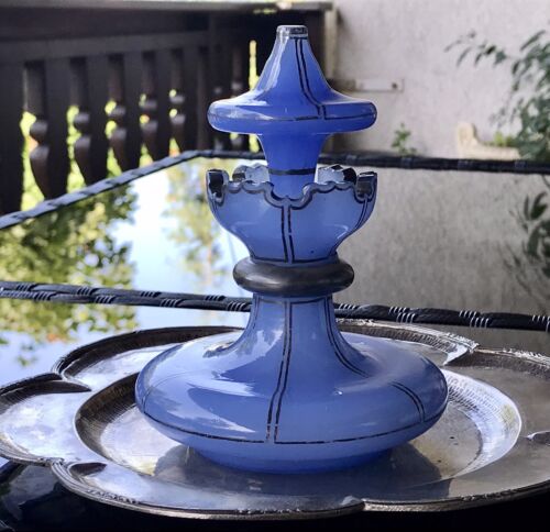Antik Biedermeier blaue Karaffe Flakon Schwarzlot-Malerei Alabasterglas Opalglas