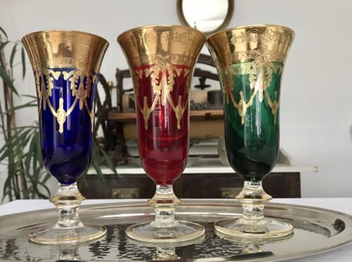 Vintage Interglass Italy 3 Sektgläser Gläser Kristallglas Sektflöten 24karatGold