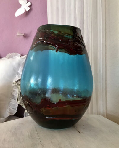 Vintage große Glaskunst Glasvase Kunstglas Vase edel blau schwer Eiform Abriss