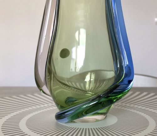 Vintage Glasvase Vase Glas grüngelb blau Czechoslovakia Karlovarske Sklo Mstisov