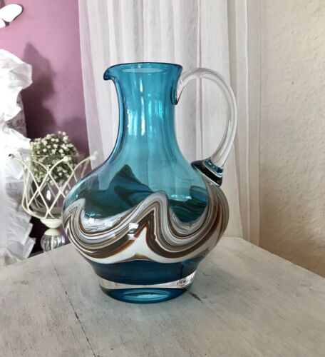 Glaskunst Vintage Vase Designer Glasvase Türkis Blau Henkelvase Kanne Kammdekor