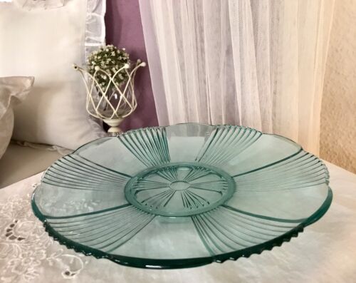 Kuchenplatte Kuchenteller türkis blau Art Déco Pressglas Schale Glas gerippt