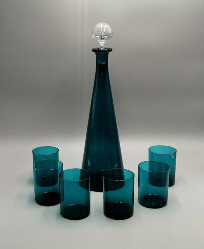 Vintage 50er 60er Design Karaffe Abriss 6 Becher Rauchglas grün petrol türkis