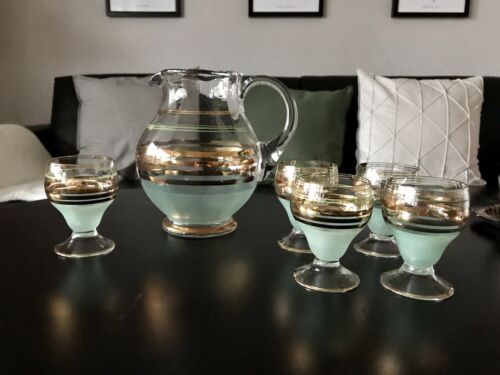 Vintage 50er 60er Krug Glaskrug Kanne Karaffe 5 Becher Glas Goldrand grün