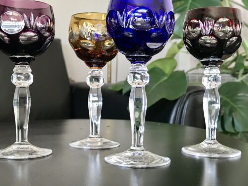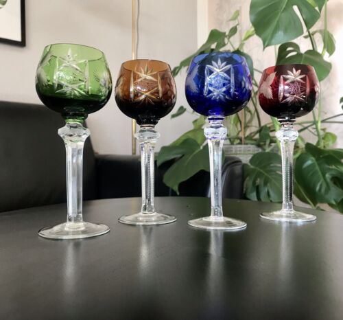 Vintage 4 wunderschöne bunte Bleikristall Likörgläser Mini Römer Überfangglas